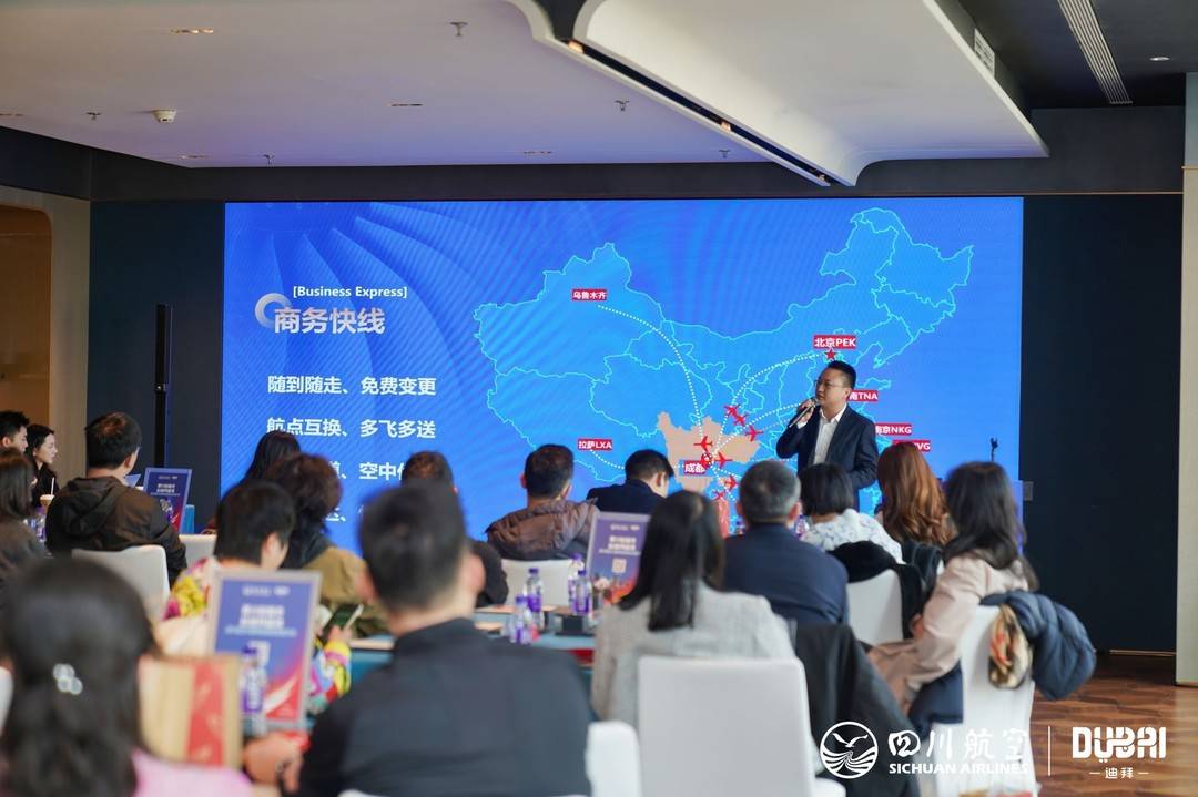 四川航空代表围绕“暖冬迪拜”航线产品进行推介。成都天府至迪拜航线每天一班。国内城市中,广州、北京、郑州、深圳、济南等地经成都枢纽中转至迪拜的客流量较高。川航也为经天府机场中转的旅客提供通程值机、中转管家、酒店休憩、候机楼自在逛吃等权益。